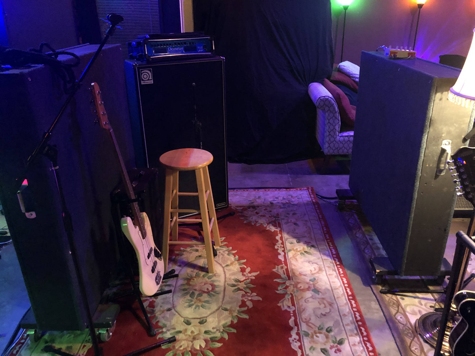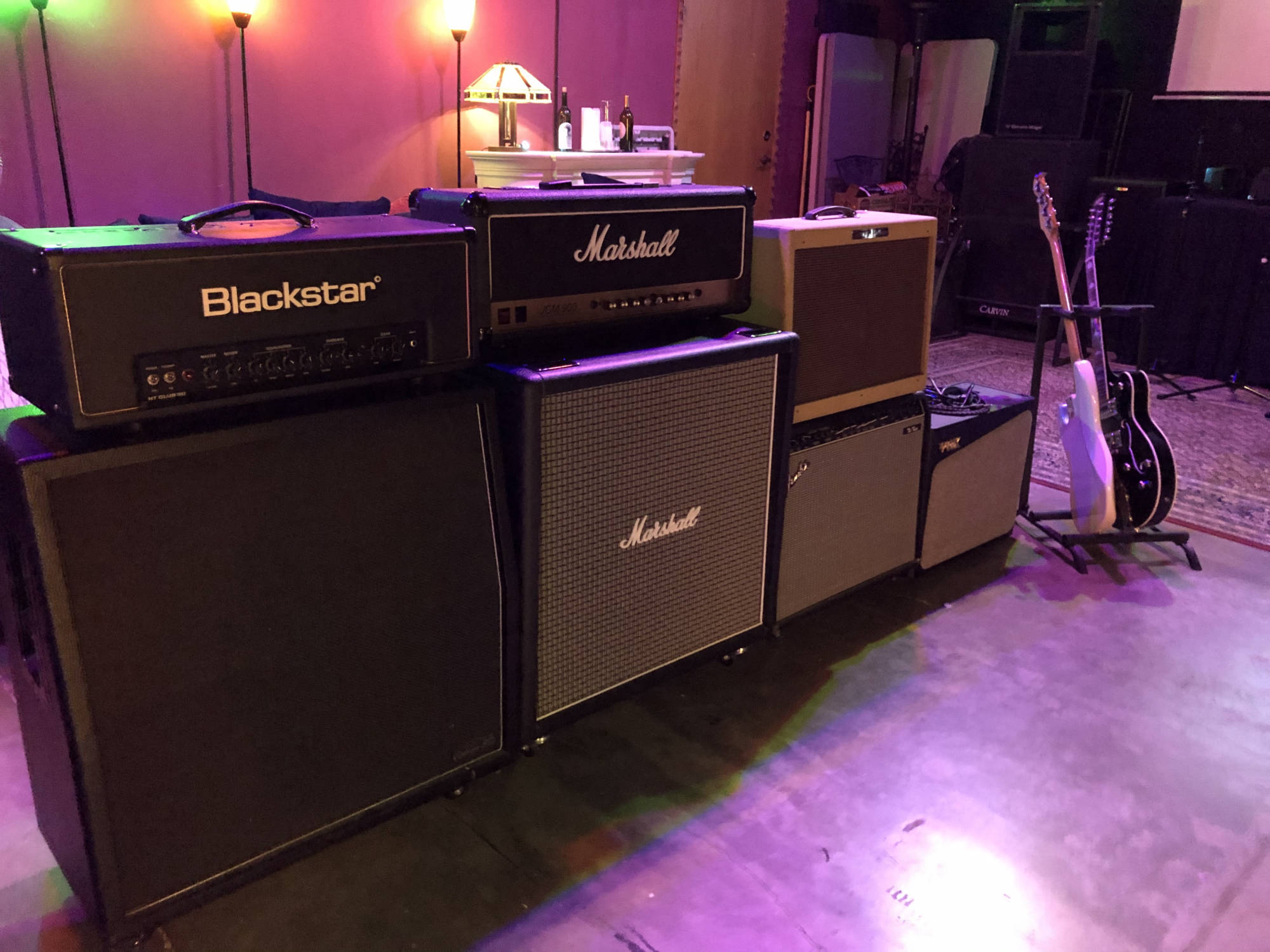 Amps: (check availability) Marshall JCM 900, Marshall JVM, Marshall Lead 4x12 Cabinet 1960BX 16 Ohms 25W Celestions, Marshall MS-2 Mini, Blackstar HT Club 50, Fender Twin, Fender Princeton Recording Amp, Fender Deluxe, Fender Frontman 15, Fender Bassman with 4x10 and 15" Cabinet, Ampeg SVT-2 Pro, Ampeg 8x10 Cabinet, Sovtek Tube Midget 50H, Line 6 Spider II